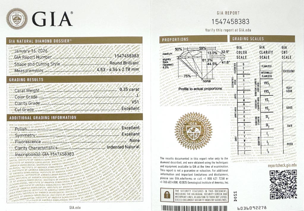 Diamant je včetně certifikátu GIA a je laserově číslován na své rundistě laboratoří GIA.