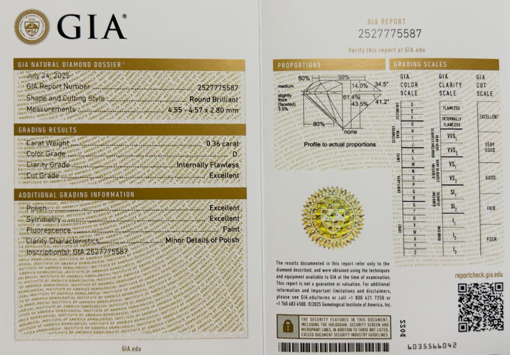 Diamant je včetně certifikátu GIA a je laserově číslován na své rundistě laboratoří GIA.