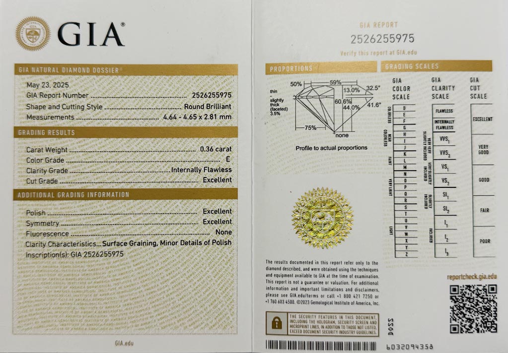 Diamant je včetně certifikátu GIA a je laserově číslován na své rundistě laboratoří GIA.