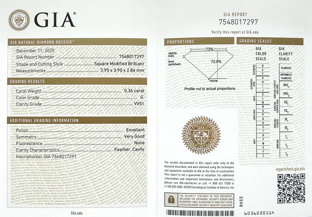 Diamant je včetně certifikátu GIA a je laserově číslován na své rundistě laboratoří GIA.