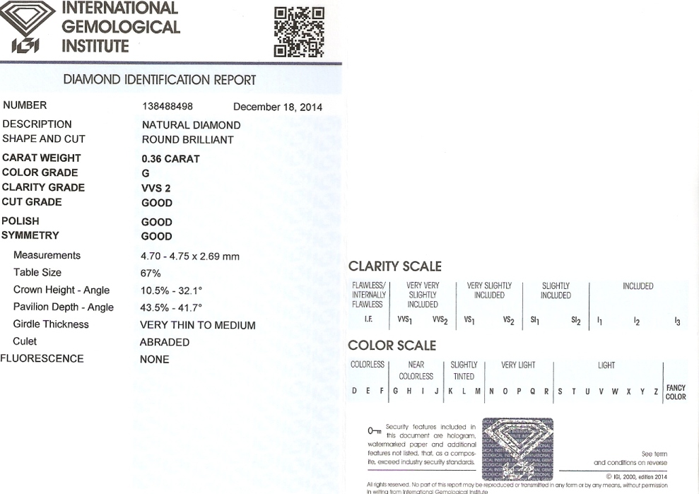 Diamant 0.36ct G/VVS2 s IGI certifikátem