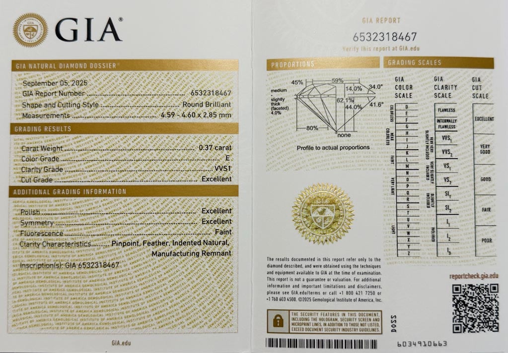 Diamant je včetně certifikátu GIA a je laserově číslován na své rundistě laboratoří GIA.