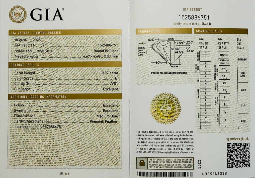 Diamant je včetně certifikátu GIA a je laserově číslován na své rundistě laboratoří GIA.