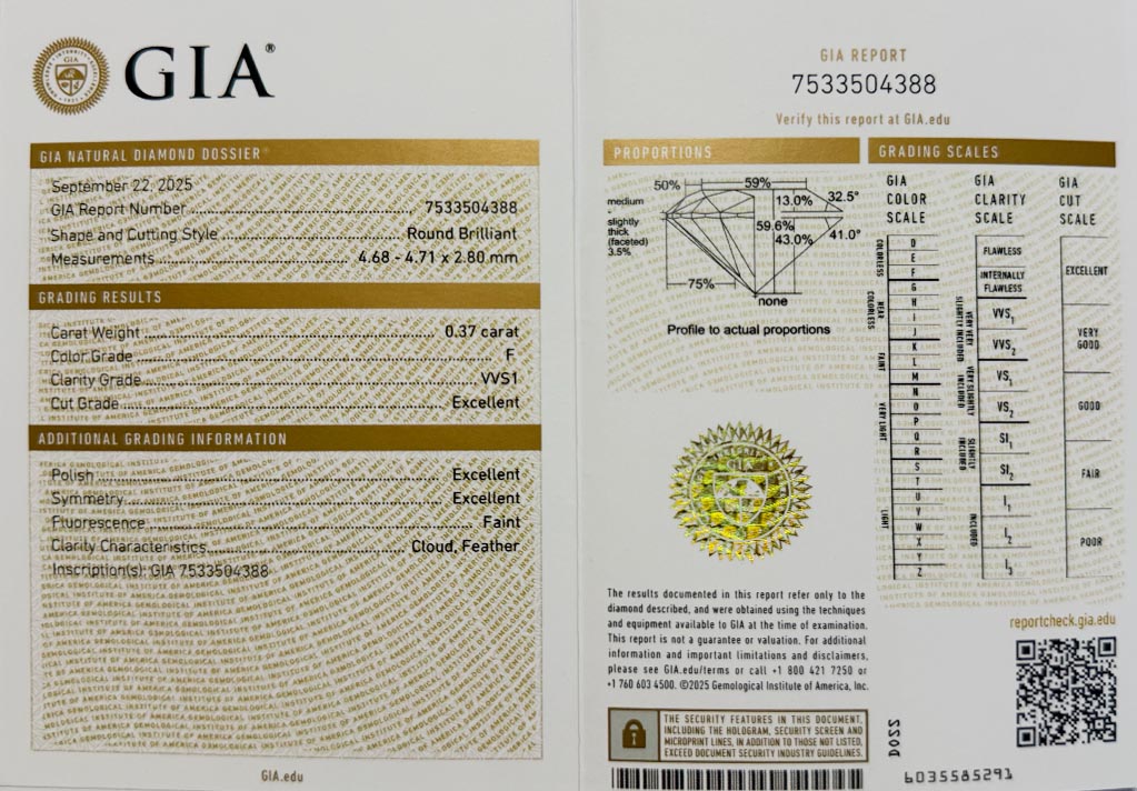 Diamant 0.37ct F/VVS1 s GIA certifikátem