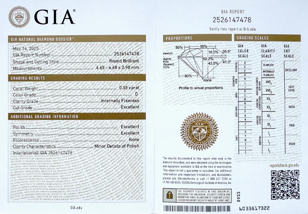 Diamant je včetně certifikátu GIA a je laserově číslován na své rundistě laboratoří GIA.