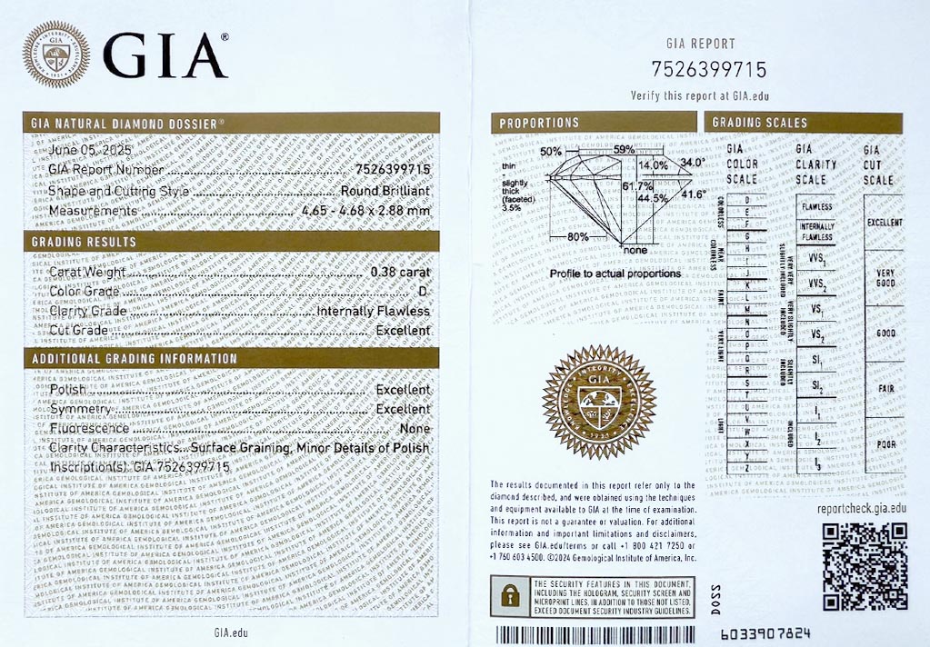 Diamant je včetně certifikátu GIA a je laserově číslován na své rundistě laboratoří GIA.