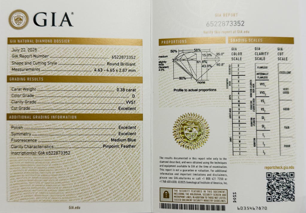 Diamant je včetně certifikátu GIA a je laserově číslován na své rundistě laboratoří GIA.