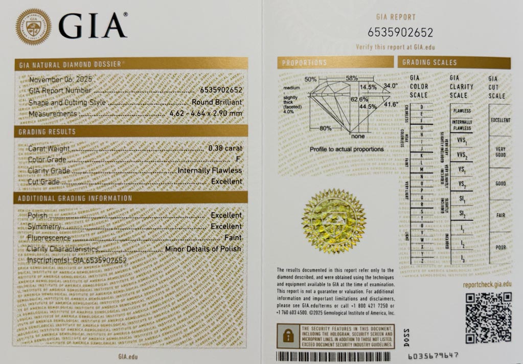 Diamant je včetně certifikátu GIA a je laserově číslován na své rundistě laboratoří GIA.