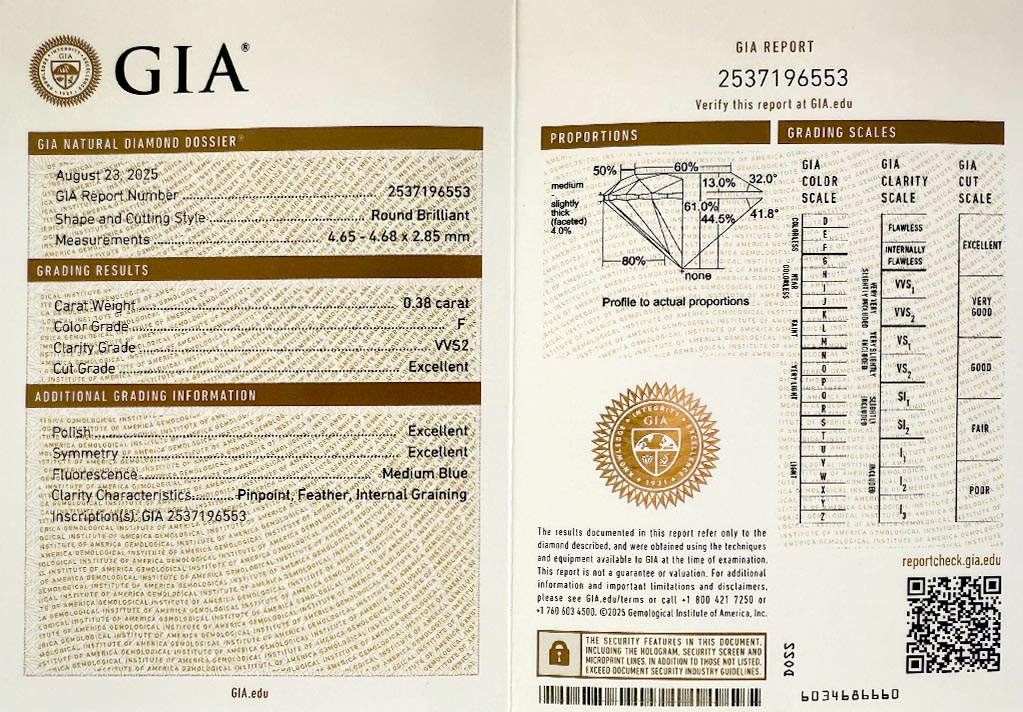 Diamant je včetně certifikátu GIA a je laserově číslován na své rundistě laboratoří GIA.
