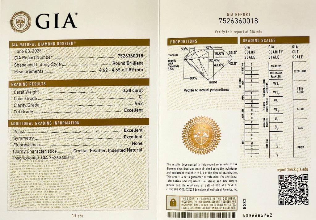Diamant je včetně certifikátu GIA a je laserově číslován na své rundistě laboratoří GIA.