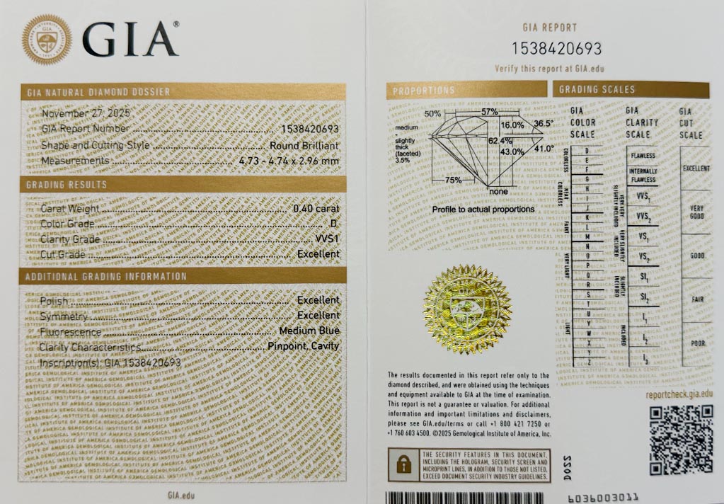 Diamant 0.40ct D/VVS1 s GIA certifikátem
