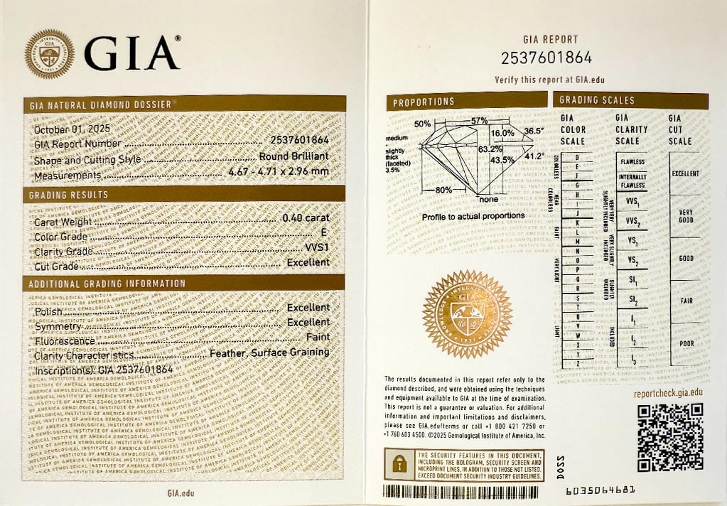 Diamant je včetně certifikátu GIA a je laserově číslován na své rundistě laboratoří GIA.