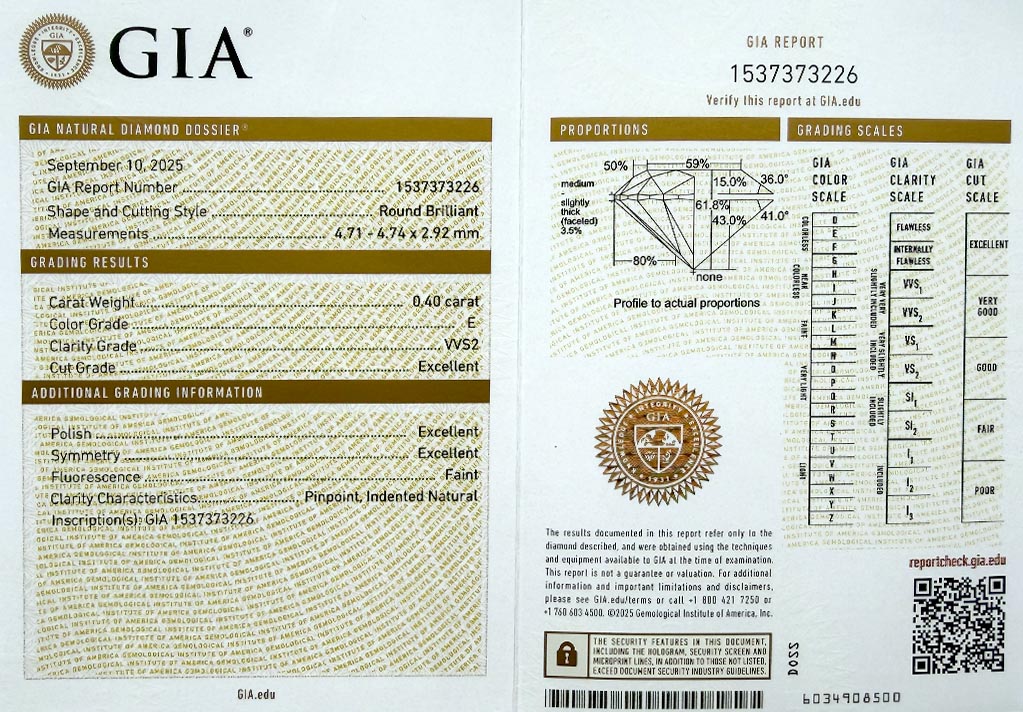 Diamant je včetně certifikátu GIA a je laserově číslován na své rundistě laboratoří GIA.