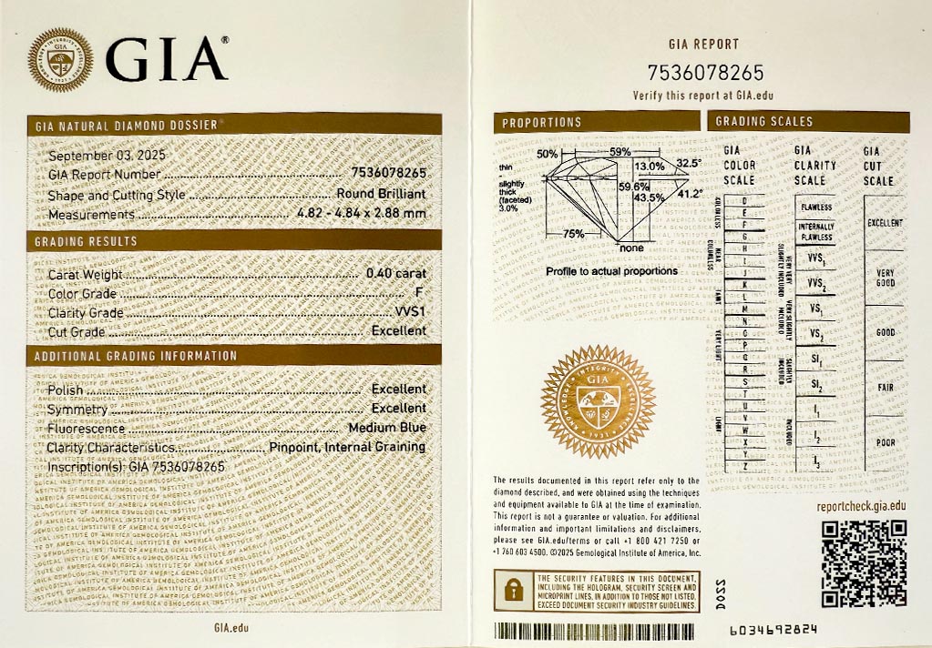 Diamant 0.40ct F/VVS1 s GIA certifikátem