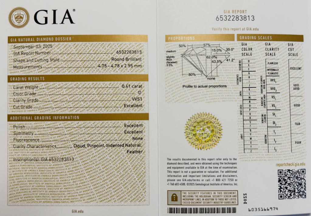 Diamant je včetně certifikátu GIA a je laserově číslován na své rundistě laboratoří GIA.