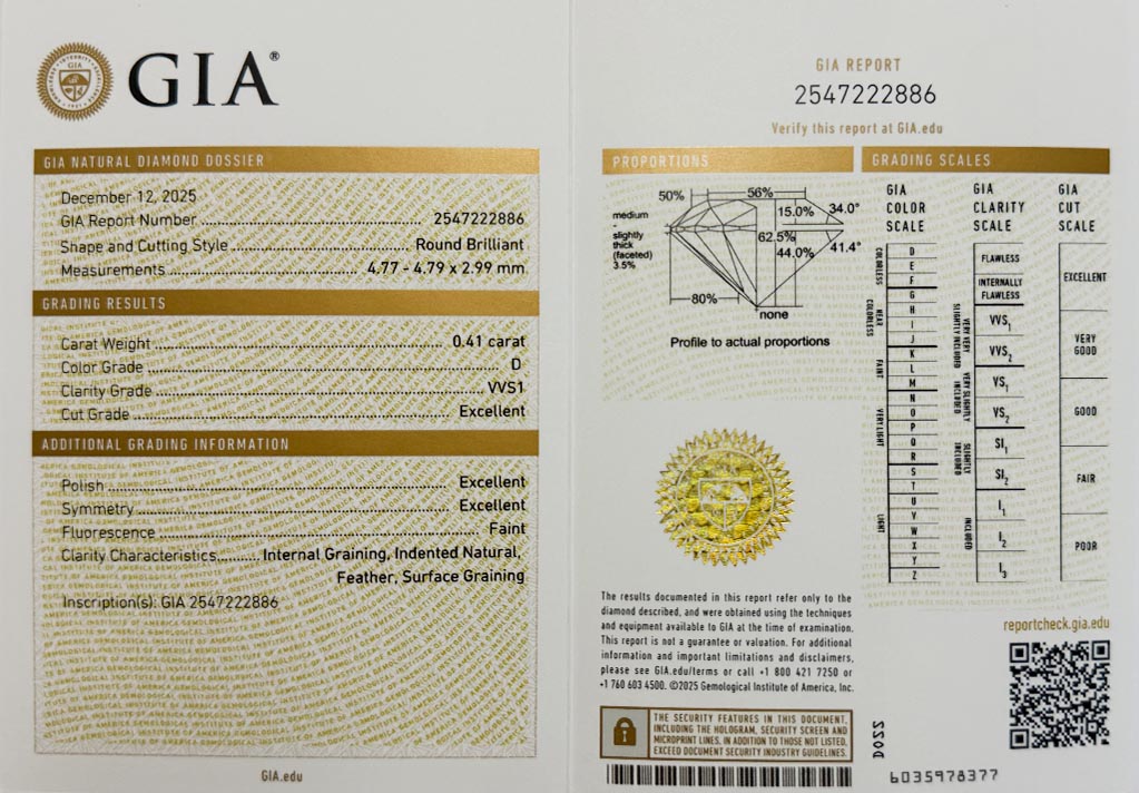 Diamant je včetně certifikátu GIA a je laserově číslován na své rundistě laboratoří GIA.