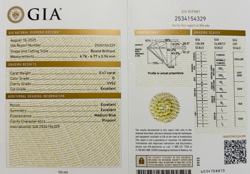Diamant je včetně certifikátu GIA a je laserově číslován na své rundistě laboratoří GIA.