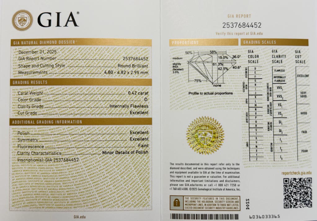 Diamant je včetně certifikátu GIA a je laserově číslován na své rundistě laboratoří GIA.