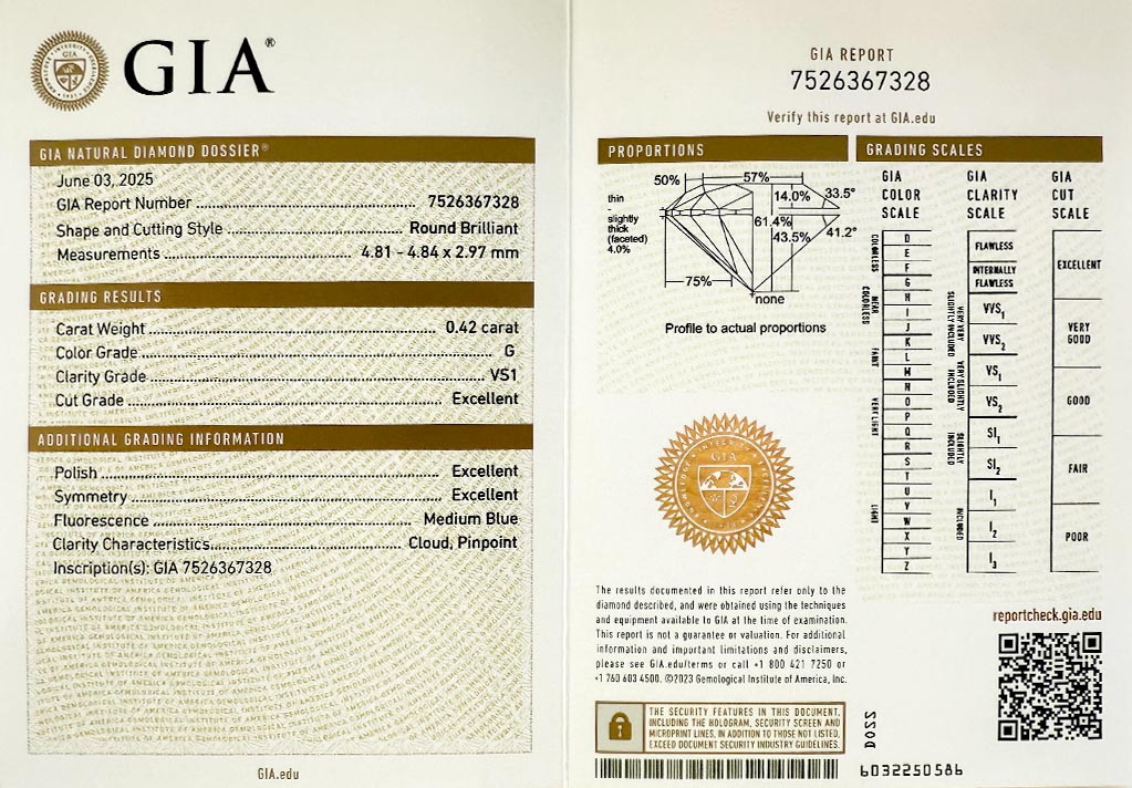 Diamant je včetně certifikátu GIA a je laserově číslován na své rundistě laboratoří GIA.