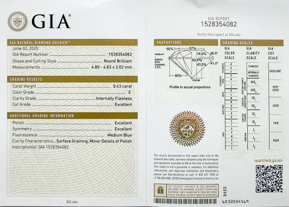 Diamant je včetně certifikátu GIA a je laserově číslován na své rundistě laboratoří GIA.