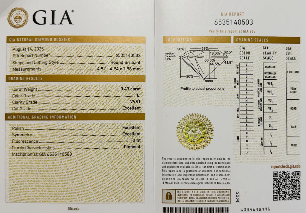 Diamant je včetně certifikátu GIA a je laserově číslován na své rundistě laboratoří GIA.