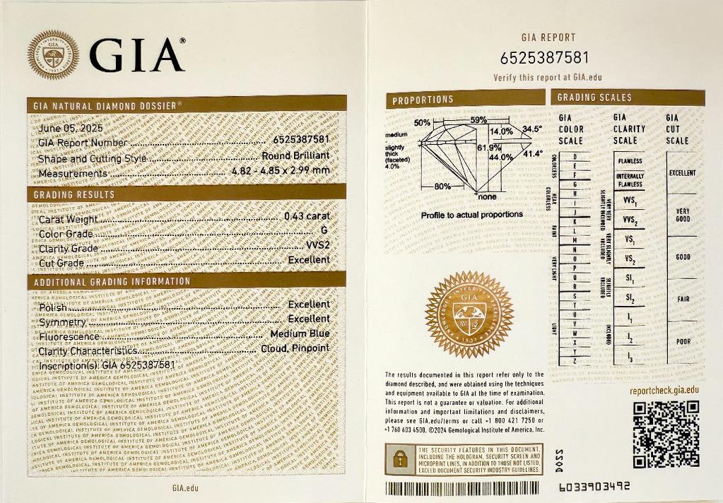 byl založen v roce 1931 a patří k absolutní špičce mezi gemologickými laboratořemi po celém světě a dodržuje pravidla stanovená Diamond High Council v plném rozsahu. Všechny diamanty na stránkách VVDiamonds opatřeny certifikátem GIA, lze verifikovat na stránkách GIA. Většina diamantů je laserově číslována pro větší bezpečnost obchodu.