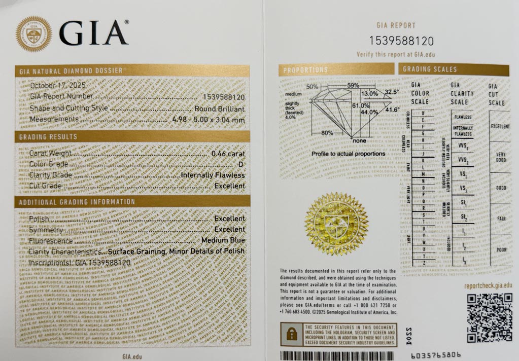 Diamant je včetně certifikátu GIA a je laserově číslován na své rundistě laboratoří GIA.