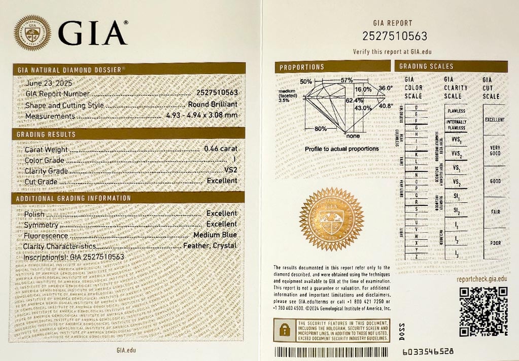 Diamant je včetně certifikátu GIA a je laserově číslován na své rundistě laboratoří GIA.