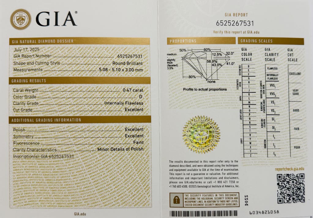 Diamant je včetně certifikátu GIA a je laserově číslován na své rundistě laboratoří GIA.
