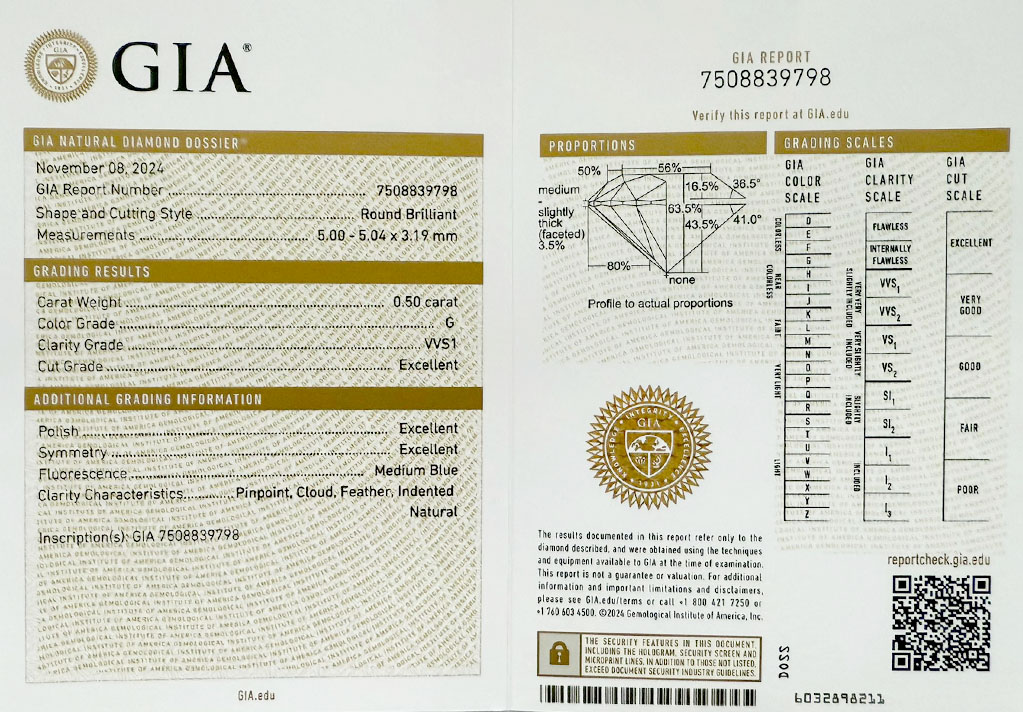 Diamant je včetně certifikátu GIA a je laserově číslován na své rundistě laboratoří GIA.