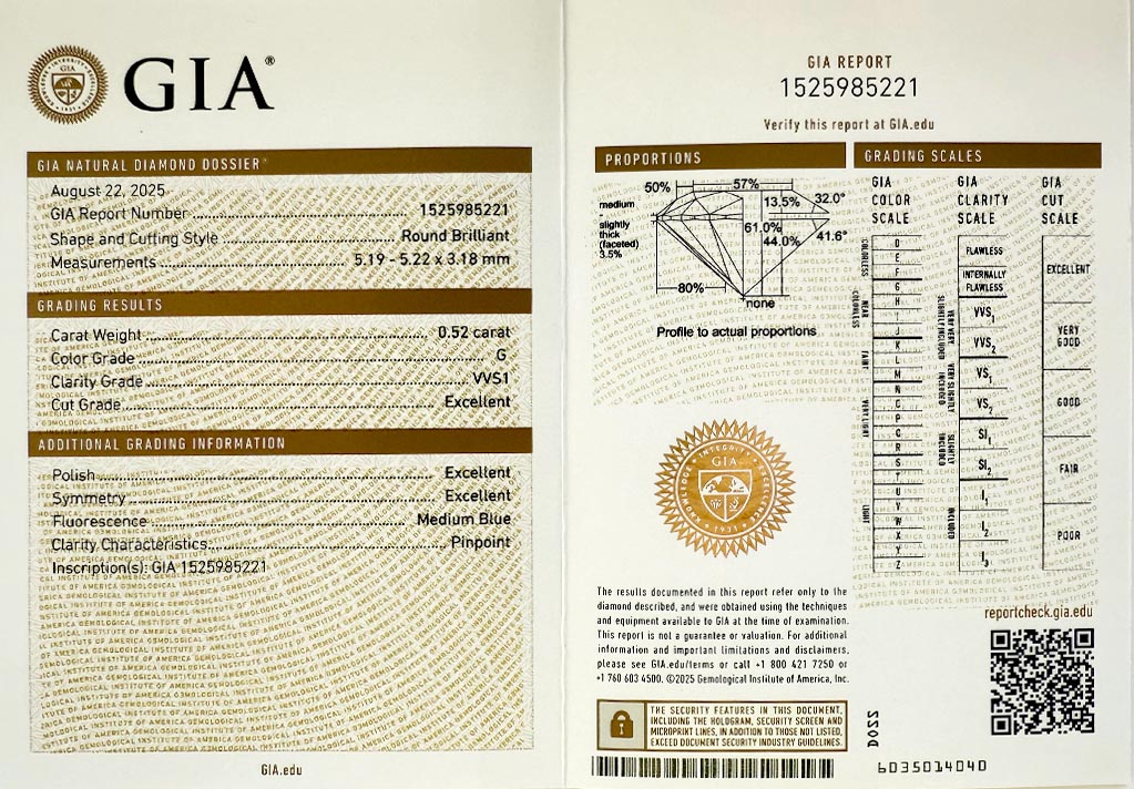 Diamant je včetně certifikátu GIA a je laserově číslován na své rundistě laboratoří GIA.