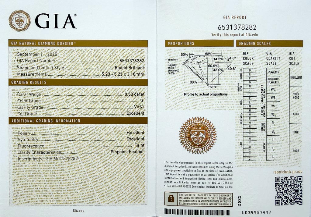 Diamant je včetně certifikátu GIA a je laserově číslován na své rundistě laboratoří GIA.