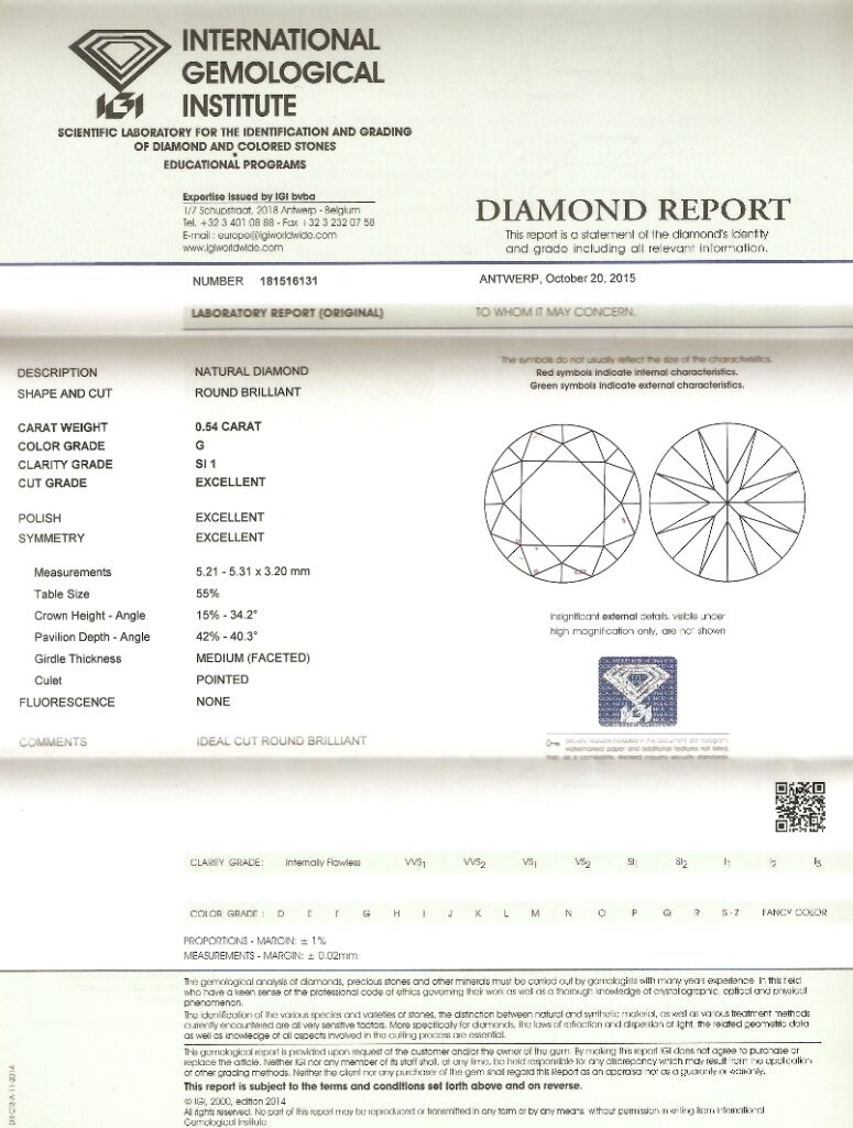 Diamant 0.54ct G/SI1 s IGI certifikátem
