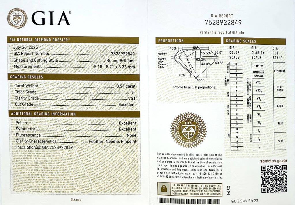Diamant 0.54ct H/VS1 s GIA certifikátem