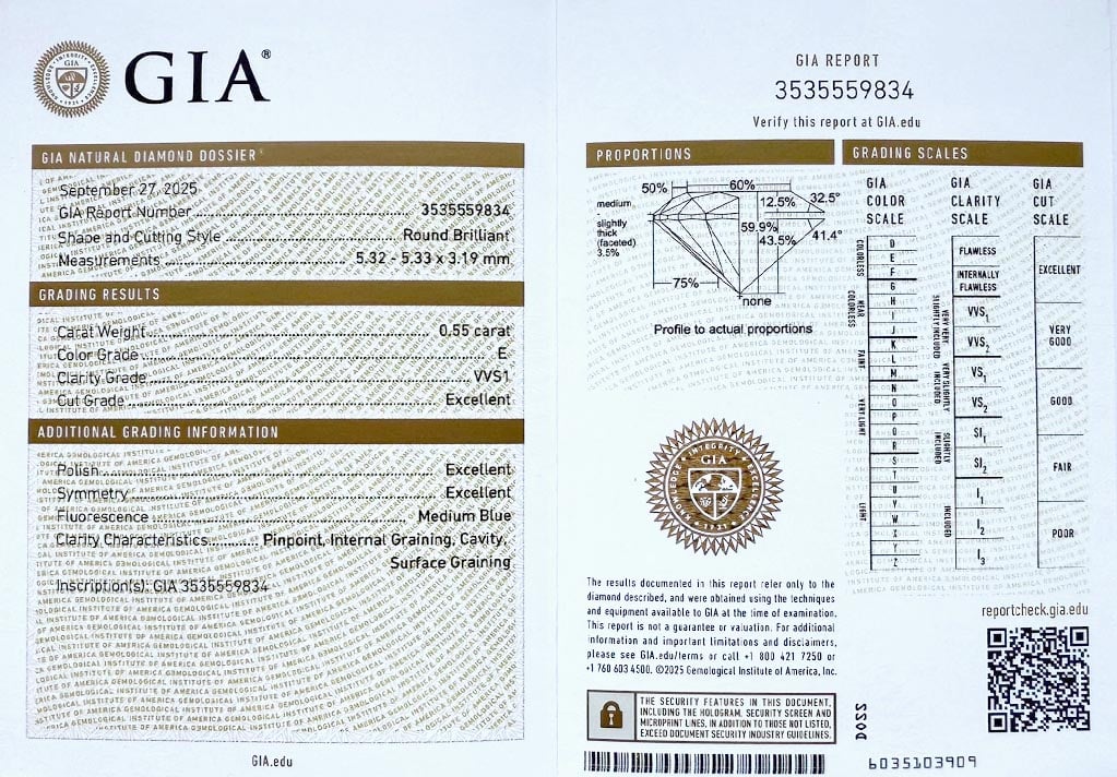 Diamant je včetně certifikátu GIA a je laserově číslován na své rundistě laboratoří GIA.