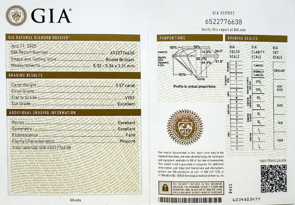 byl založen v roce 1931 a patří k absolutní špičce mezi gemologickými laboratořemi po celém světě a dodržuje pravidla stanovená Diamond High Council v plném rozsahu. Všechny diamanty na stránkách VVDiamonds opatřeny certifikátem GIA, lze verifikovat na stránkách GIA. Většina diamantů je laserově číslována pro větší bezpečnost obchodu.