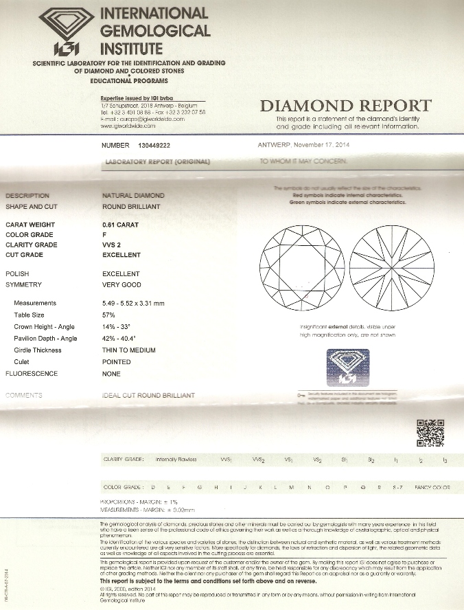 Diamant 0.61ct F/VVS2 s IGI certifikátem