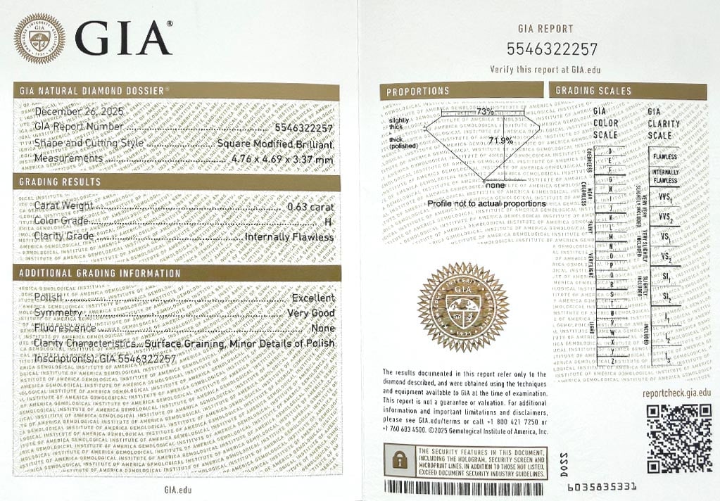 Diamant je včetně certifikátu GIA a je laserově číslován na své rundistě laboratoří GIA.