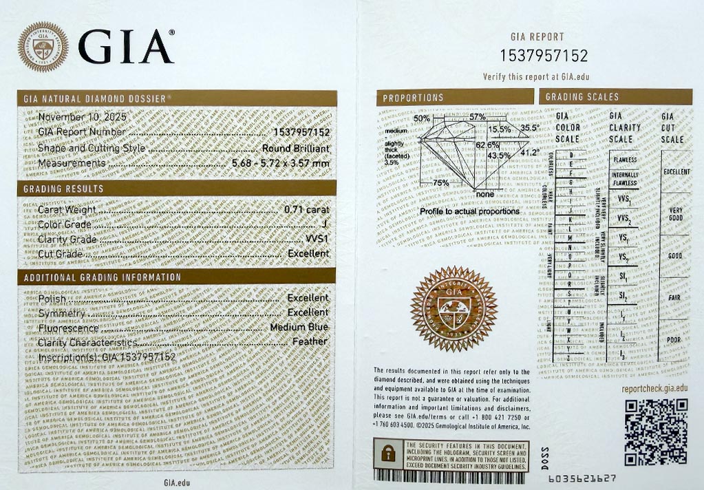 Diamant je včetně certifikátu GIA a je laserově číslován na své rundistě laboratoří GIA.