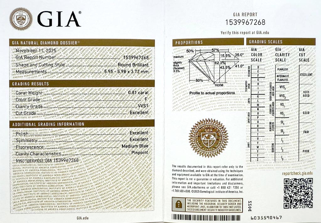 Diamant je včetně certifikátu GIA a je laserově číslován na své rundistě laboratoří GIA.