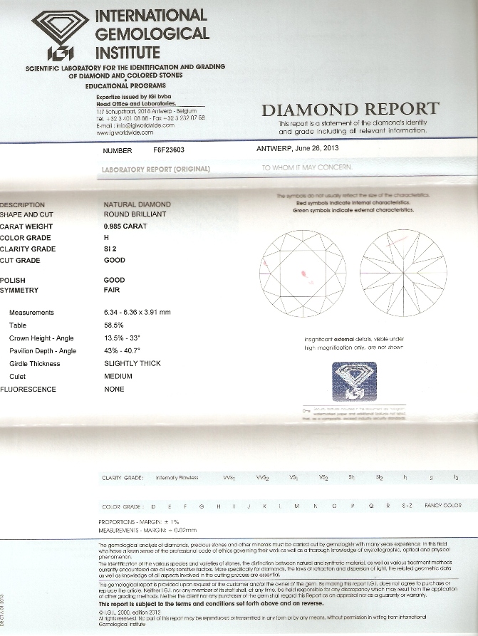 Diamant 0.985ct H/SI2 s IGI certifikátem
