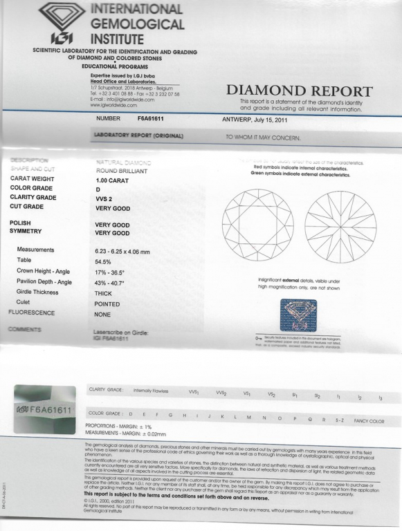 Diamant je včetně certifikátu IGI, je laserově číslován na své rundistě laboratoří IGI a zataven v ochranném pouzdře laboratoře IGI. Na diamant nelze aplikovat 5% sleva pro registrované uživatele.
