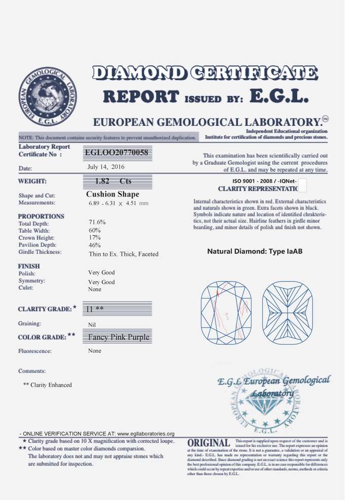 Diamant 1.82ct Fancy Pink Purple/I1 CE s EGL