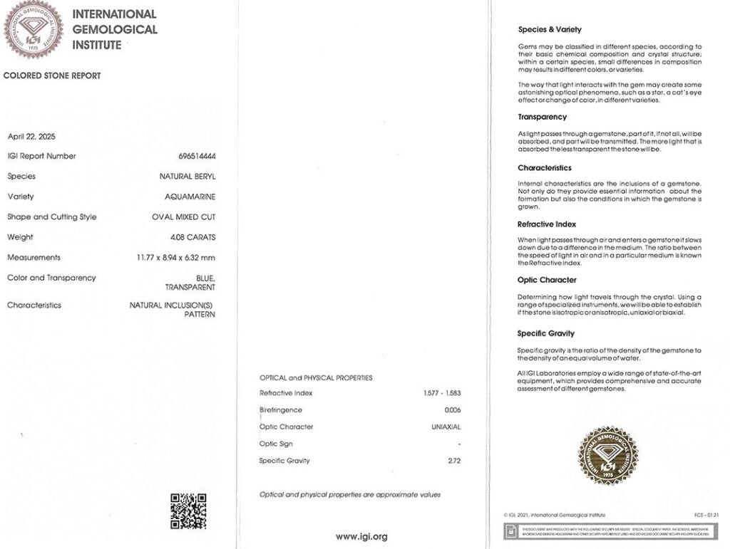 Kámen je včetně mezinárodně uznávaného certifikátu IGI a je zataven do ochranného pouzdra.