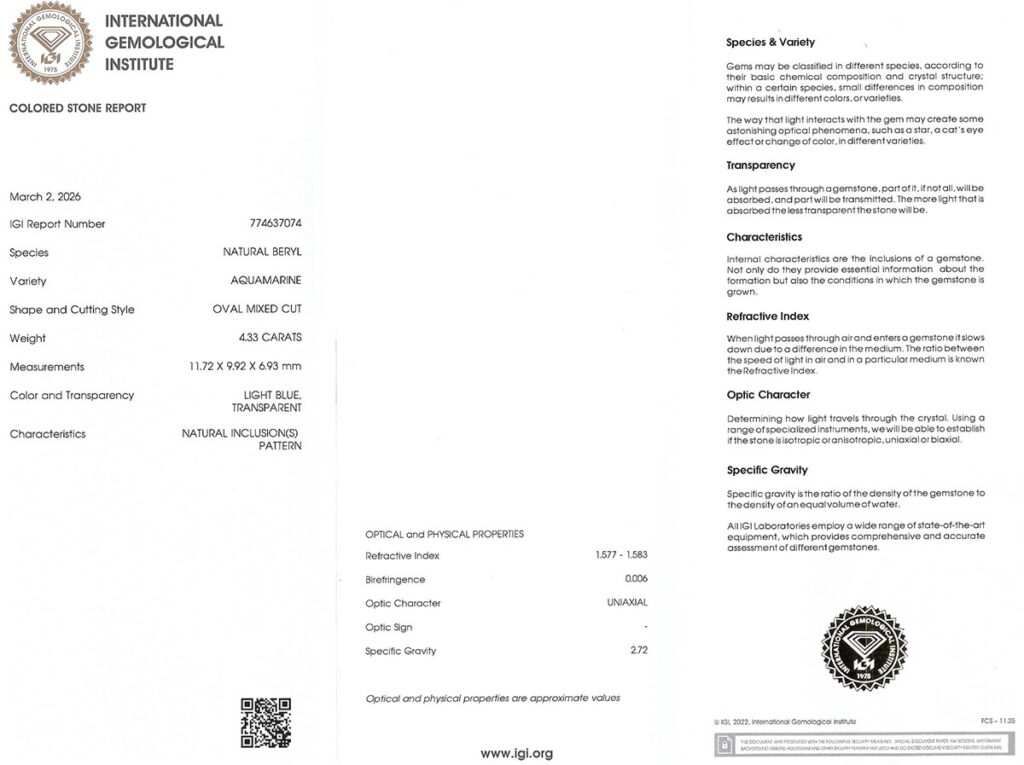 Kámen je včetně mezinárodně uznávaného certifikátu IGI a je zataven do ochranného pouzdra.
