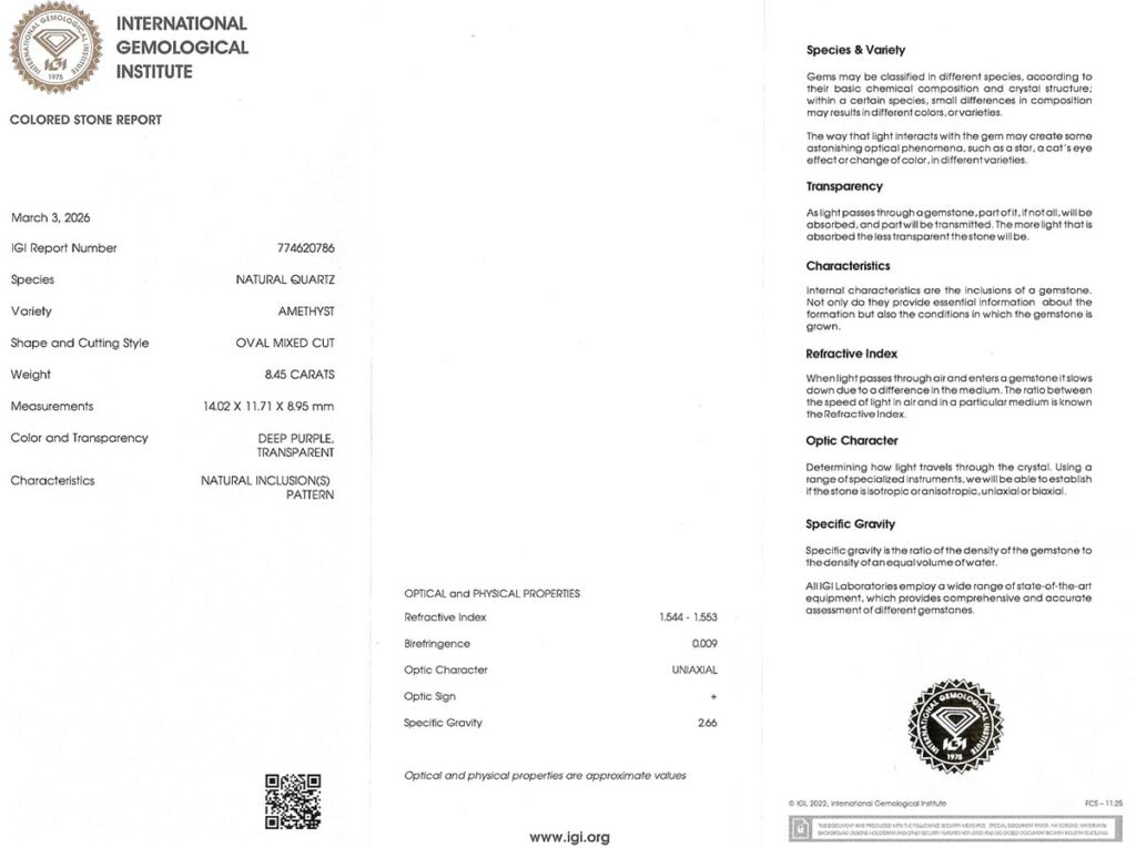 ametyst 8.45ct deep purple s IGI certifikátem