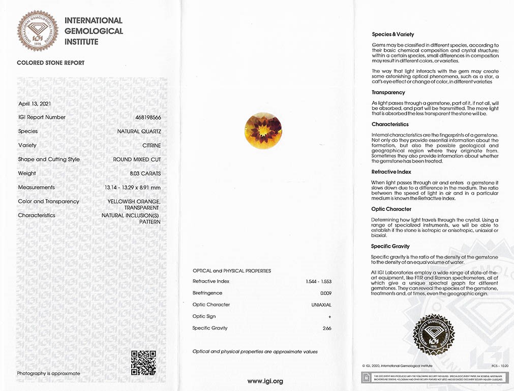 citrín 8.03ct yellowish orange s IGI certifikátem