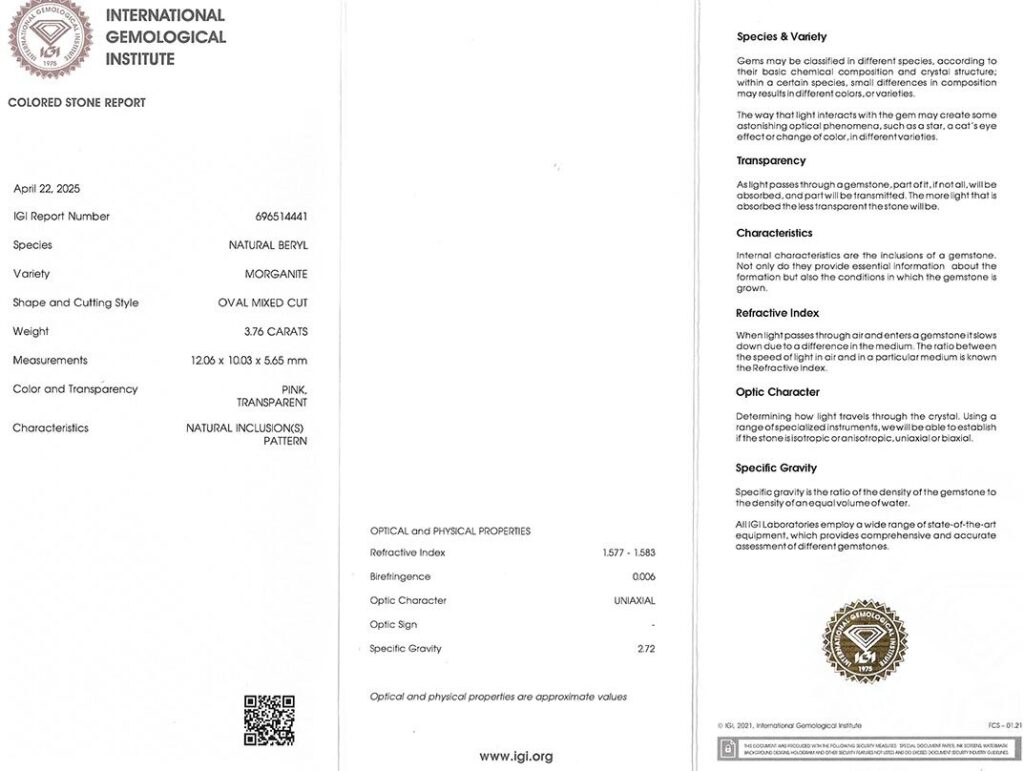 morganit 3.76ct pink s IGI certifikátem