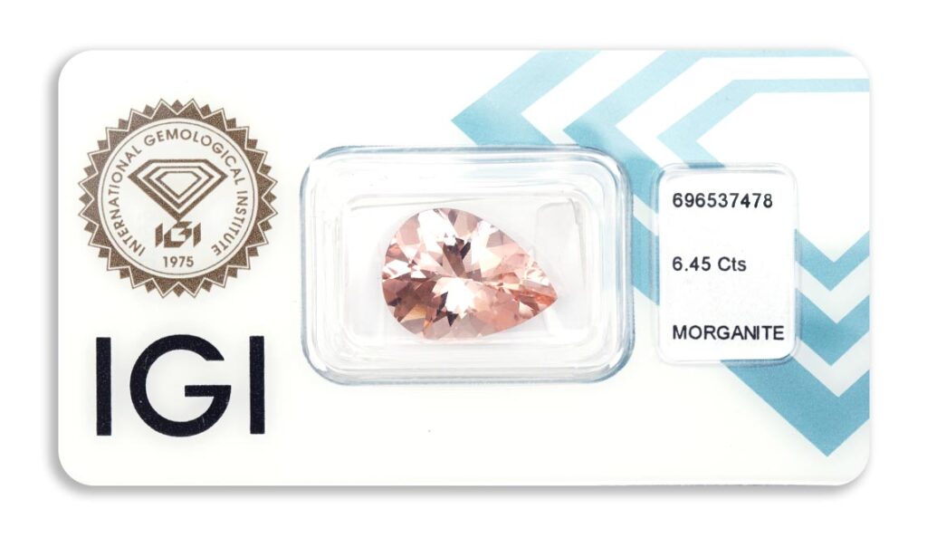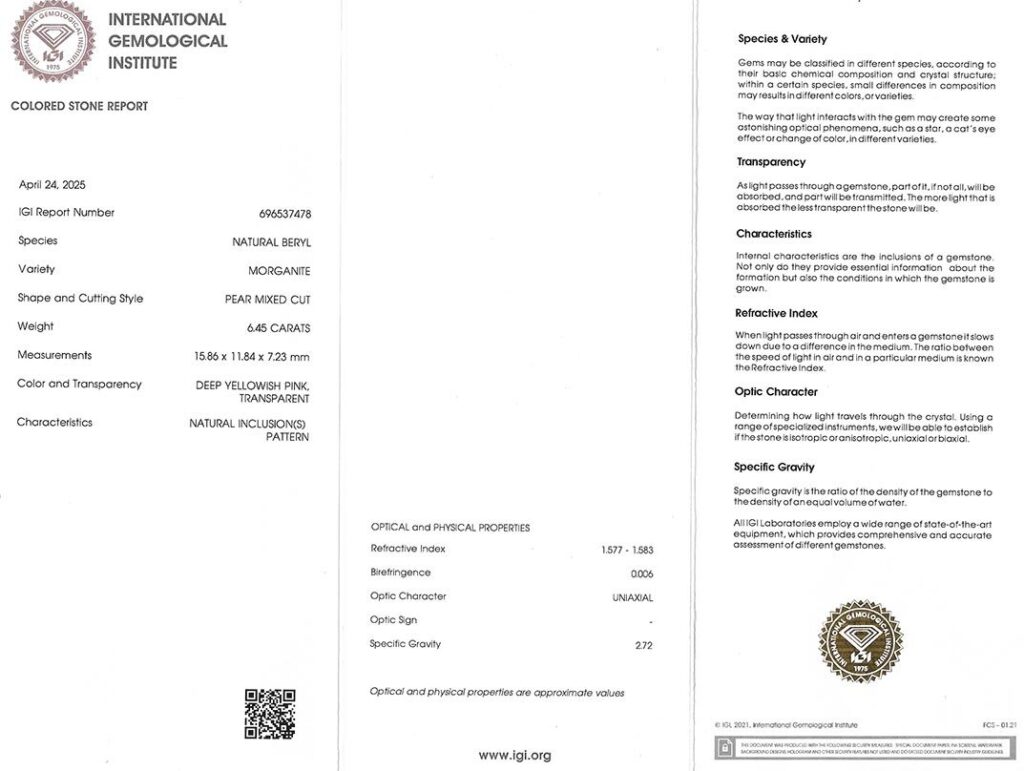 morganit 6.45ct deep yellowish pink s IGI certifikátem