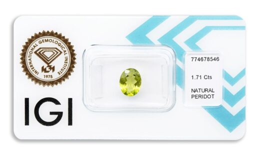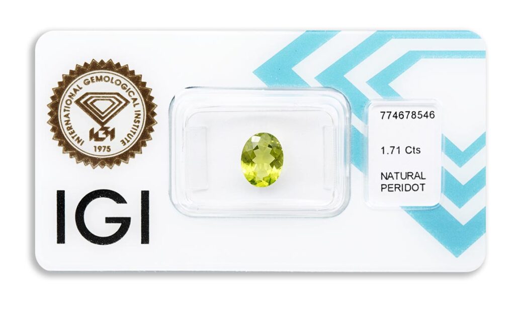 peridot 1.71ct deep yellowish green s IGI certifikátem